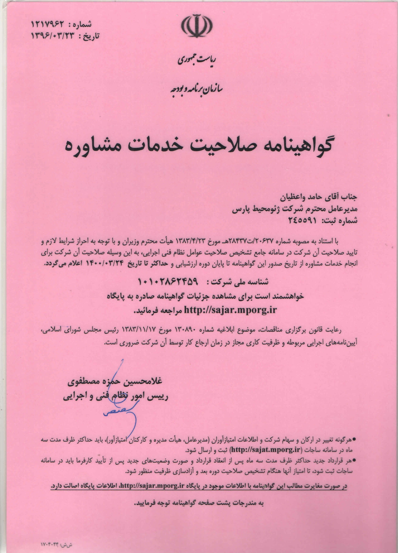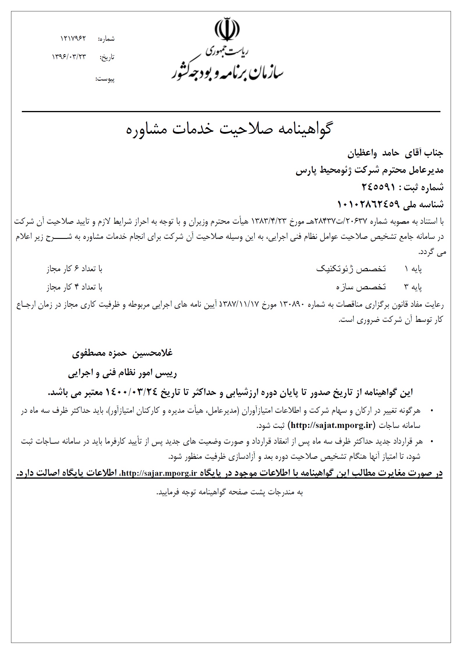مهندسین مشاور ژئومحیط پارس در حال حاضر، حائز تائید صلاحیت در تخصصهای زیر از معاونت برنامهریزی و نظارت راهبردی ریاست جمهوری میباشد.